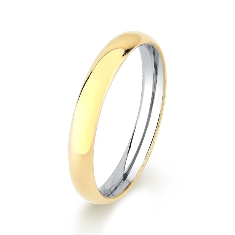 Aliança confeccionada em aço recoberta na parte externa por uma camada em ouro 10k. Com formato interno anatômico e externo abaulado.
