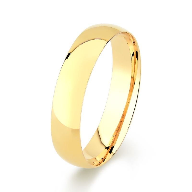 Aliança confeccionada em ouro 10k, com formato interno anatômico, para um maior conforto no uso, e externo abaulado.