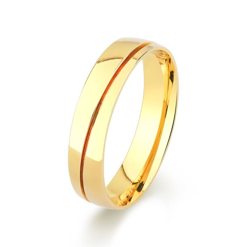Aliança confeccionada em ouro 18k, com formato interno reto e externo Abaulado.