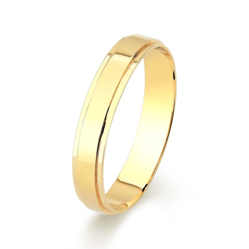 Aliança confeccionada em ouro 18k, com formato interno reto e externo reto com rebaixo lateral.