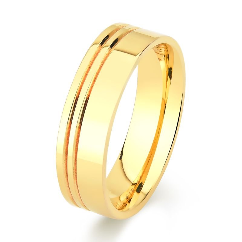Aliança confeccionada em ouro 18k, com formato interno anatômico, para um maior conforto no uso, e externo reto.