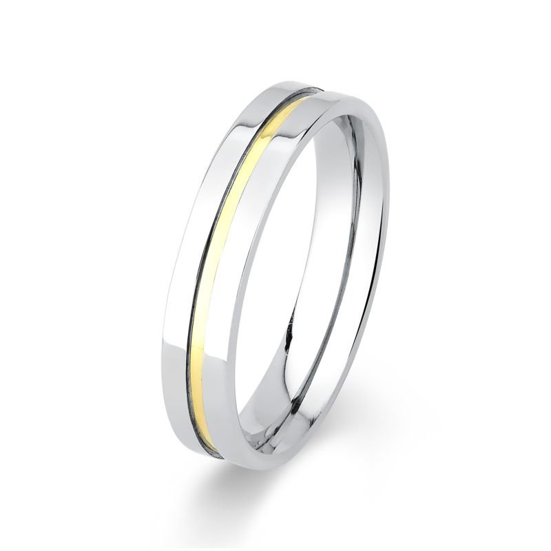 Aliança confeccionada em aço inox com interno anatômico para um maior conforto no uso e externo reto e 1 filete em ouro de 0,5 cm.