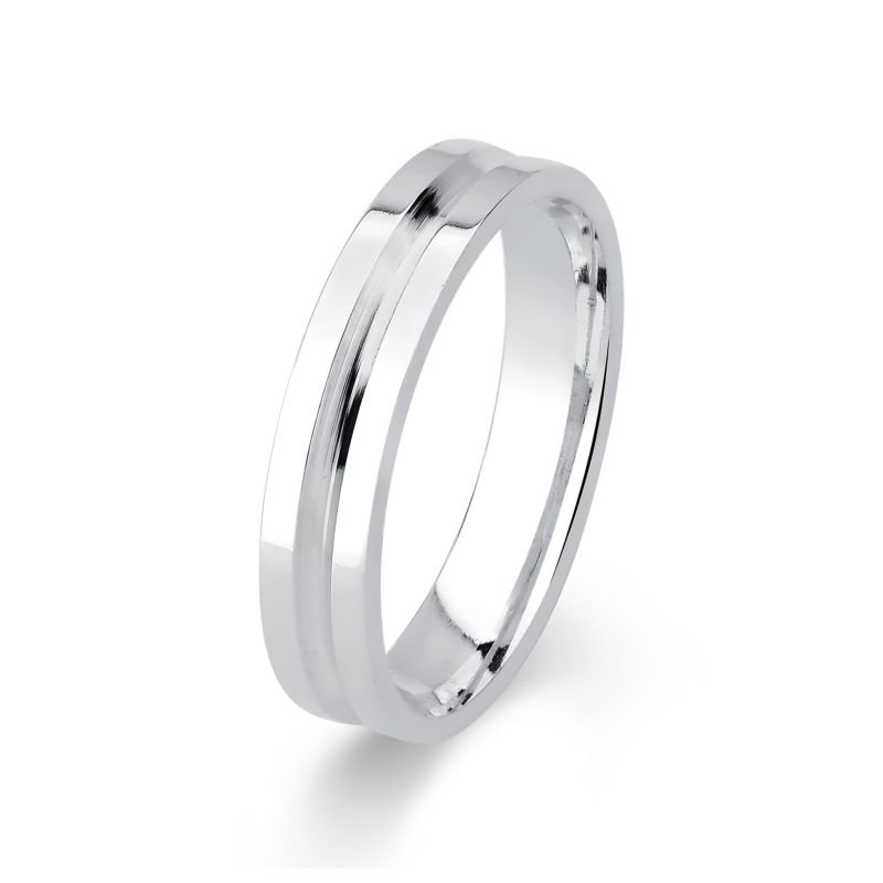 Aliança confeccionada em prata 925 com interno semi-anatômico para um maior conforto no uso e externo reto com um friso central.