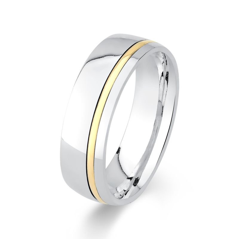 Aliança confeccionada em prata 925 com interno anatômico para um maior conforto no uso e externo abaulado com 1 filete de 0,5 cm em ouro.