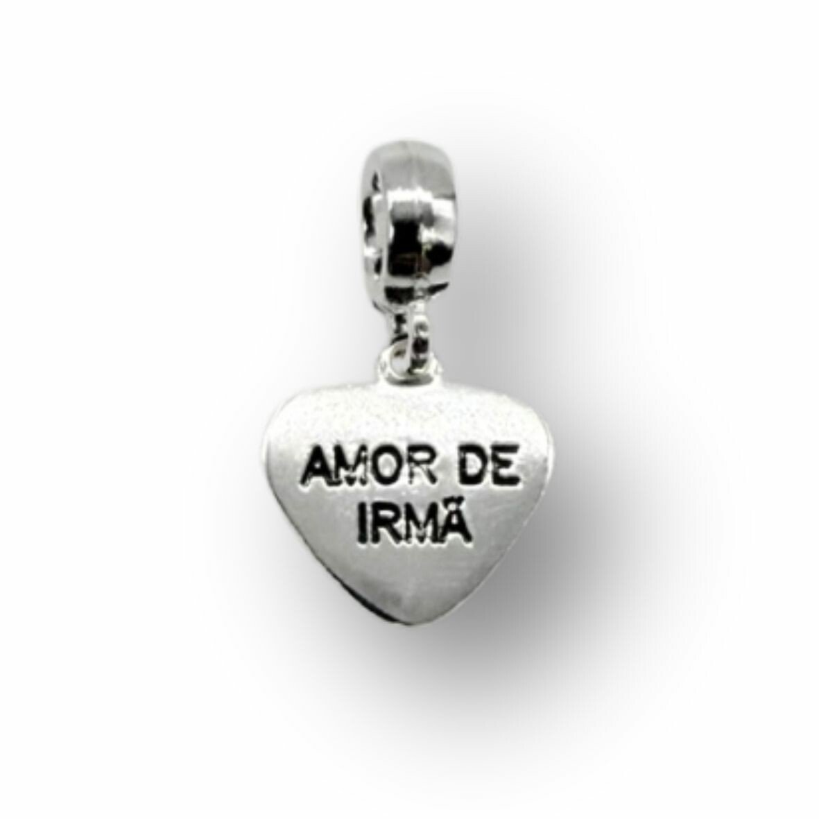 Berloque em formato de coração com a escrita "Amor de Irmã.