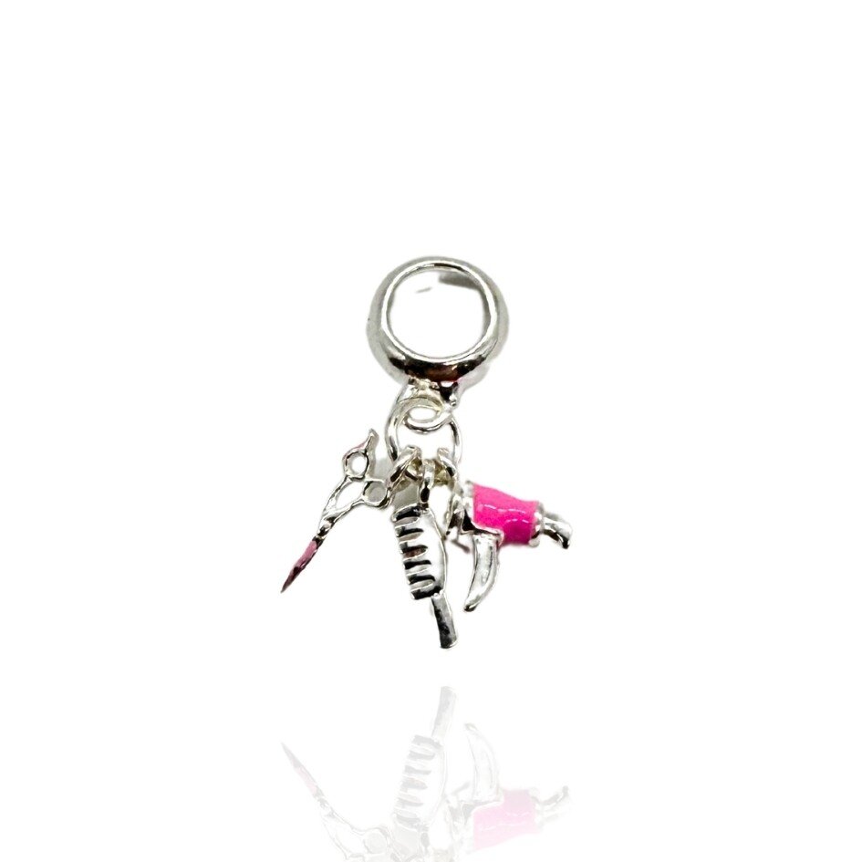 Berloque profissão cabeleireira com pingentes de tesoura, pente e frasco de shampoo - um tributo à arte de cuidar e embelezar.