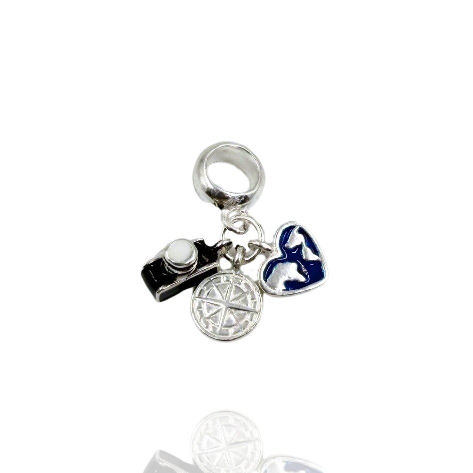 Berloque câmera fotográfica e coração representando o globo Terrestre.