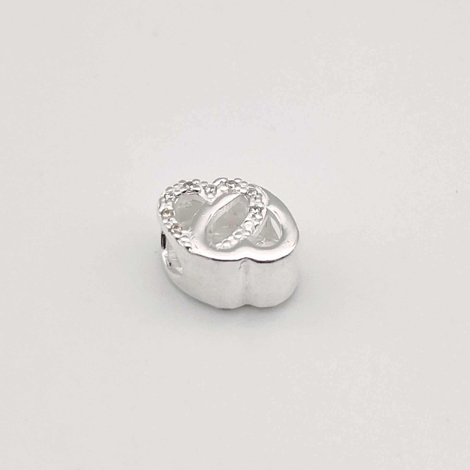 Berloque estilo separador em formato de 2 corações entrelaçados e zircônias.