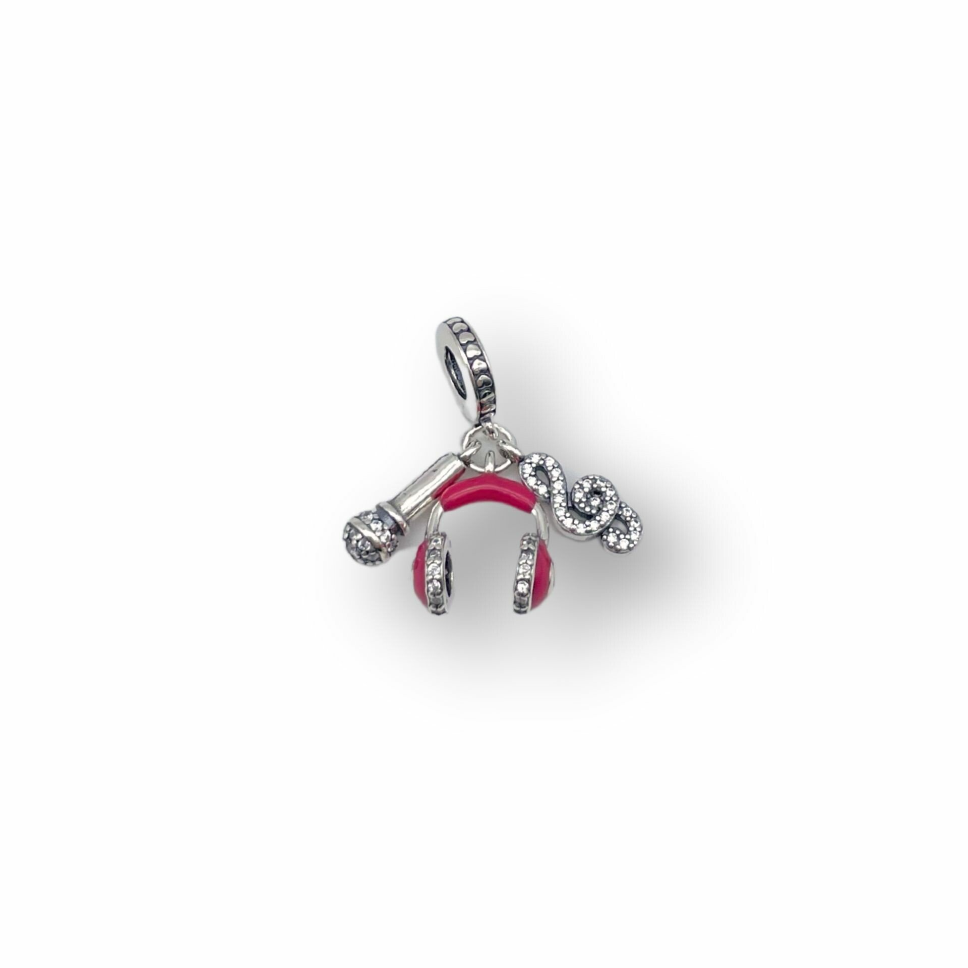 Berloque em formato fone de ouvido, microfone e símbolo musical.