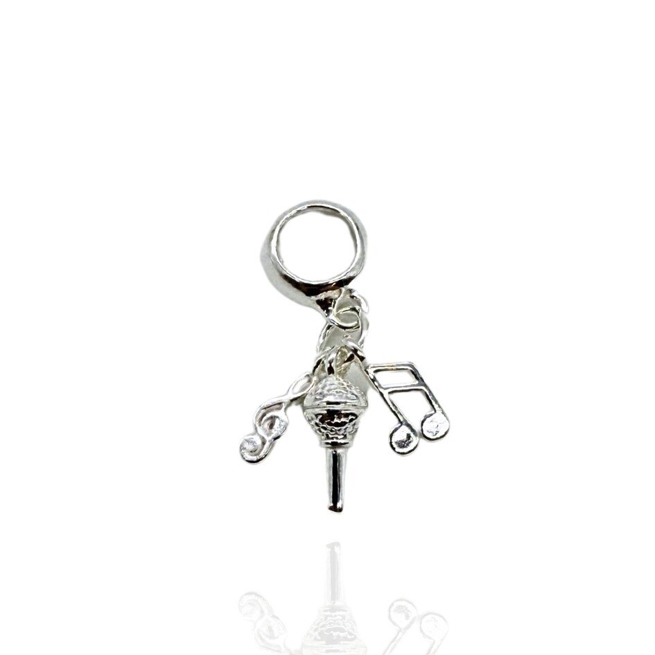 Berloque com três pingentes: Microfone, clave musical e clave de sol.
