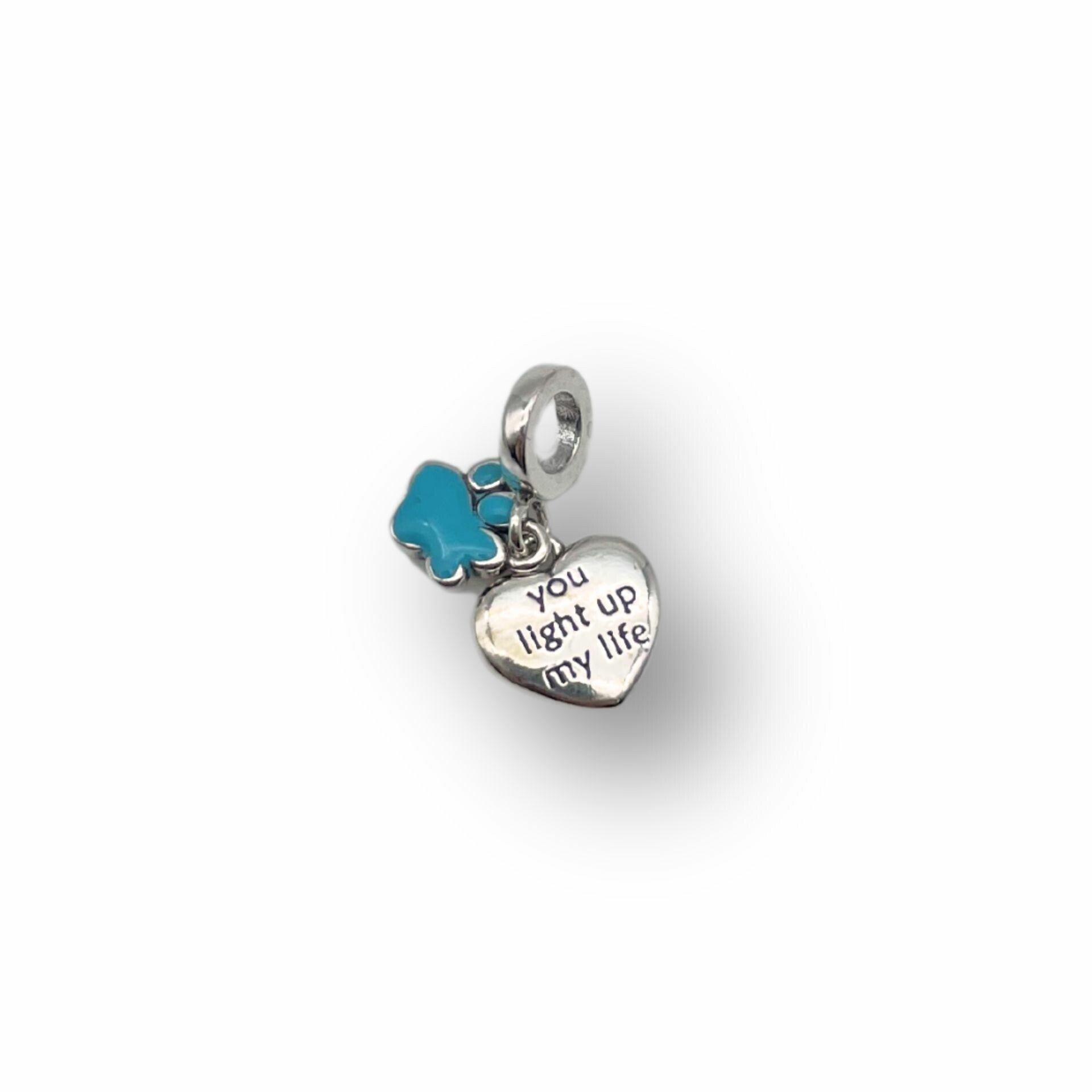 Berloque em formato de pata de cachorro e um coração com a escrita "you light up my life".