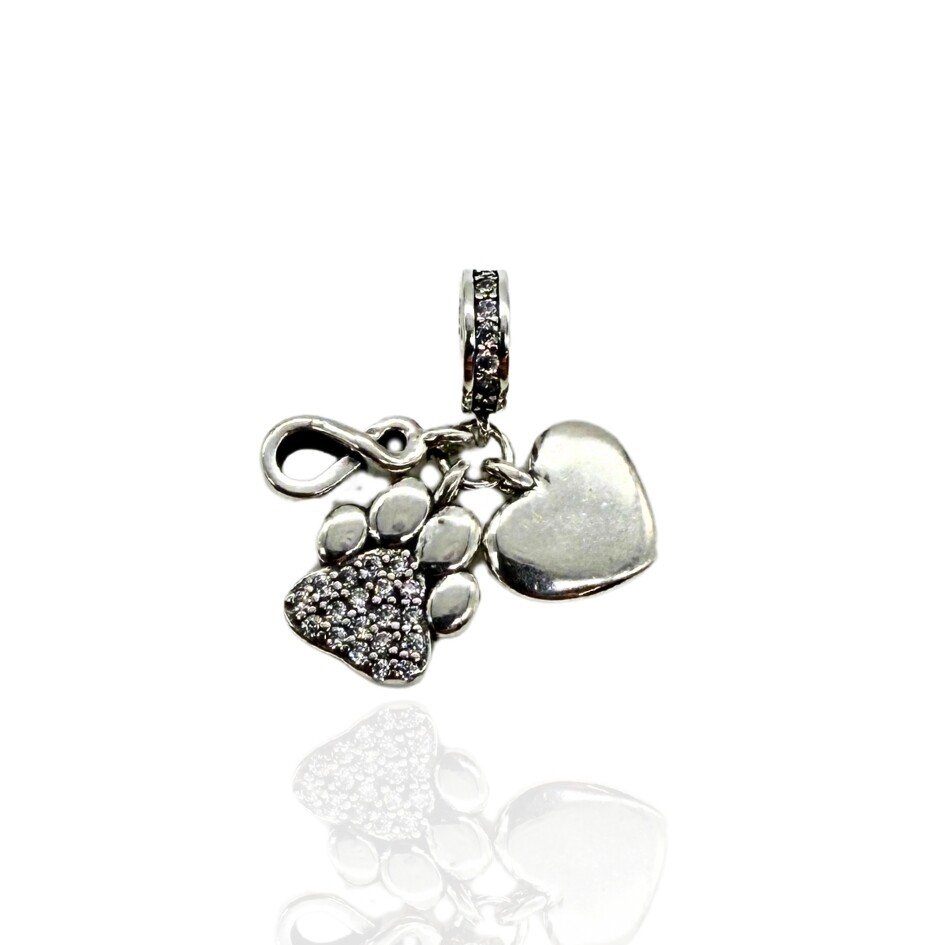 Berloque com pingentes em formato patinha de cachorro com zircônias, coração e símbolo do infinito.
