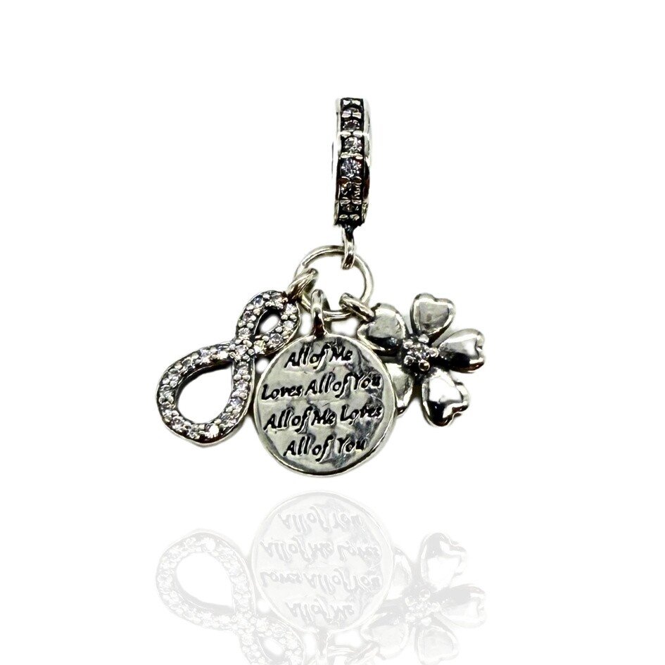 Berloque em prata 925, formato de símbolo do infinito com zircônias, uma flor e os dizeres "Al of me loves all of you".