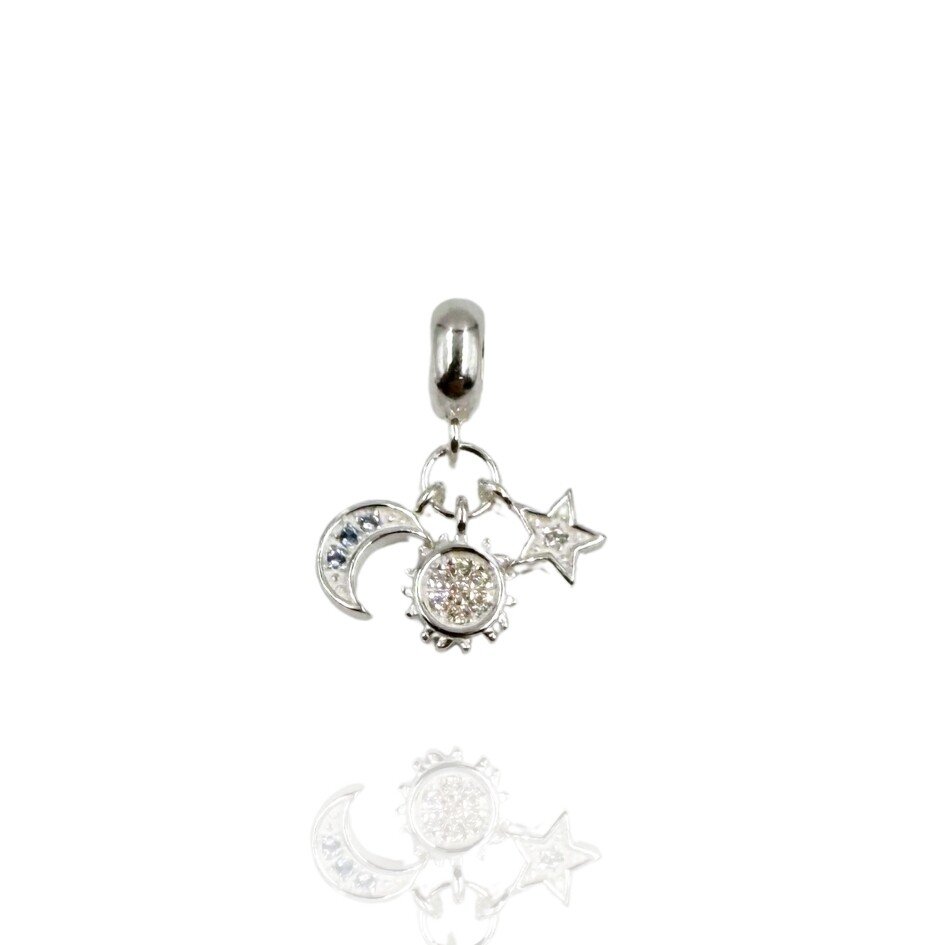 Berloque com pingentes sol, lua e estrela com zircônias.