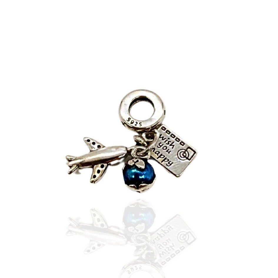 Berloque simbolizando viagens. 3 pingentes: documento, Avião e o Globo Terrestre.
