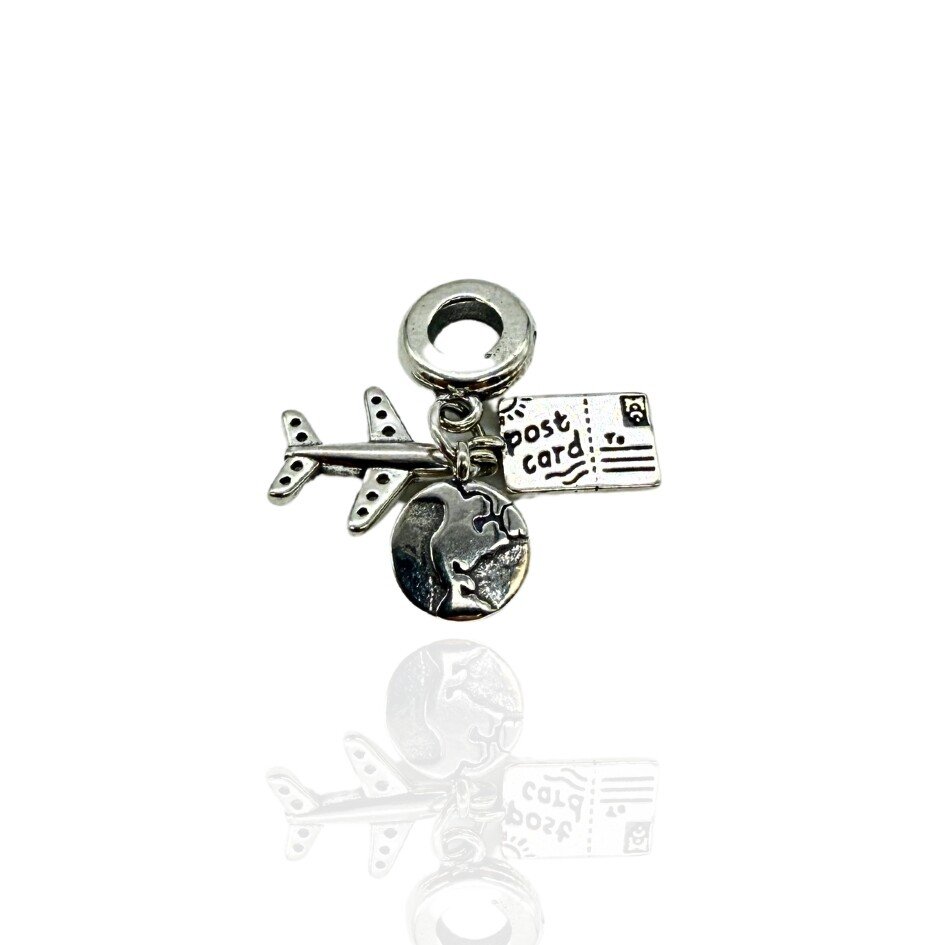Berloque simbolizando viagens. 3 pingentes: documento, Avião e o Globo Terrestre.