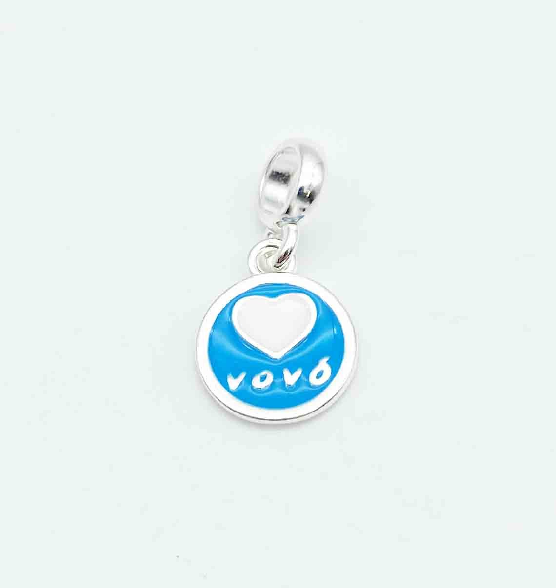 Berloque em formato redondo de cor azul e escrito Vovó.