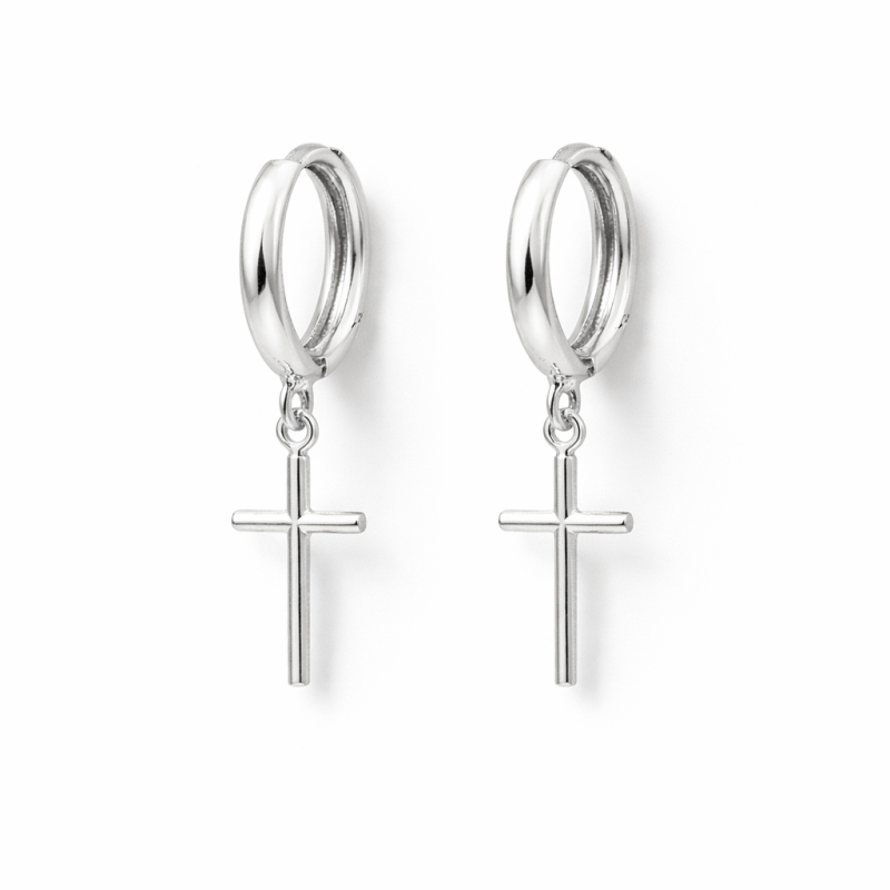 Par de brincos em prata 925. Brincos formato de argolas com pingente de cruz.