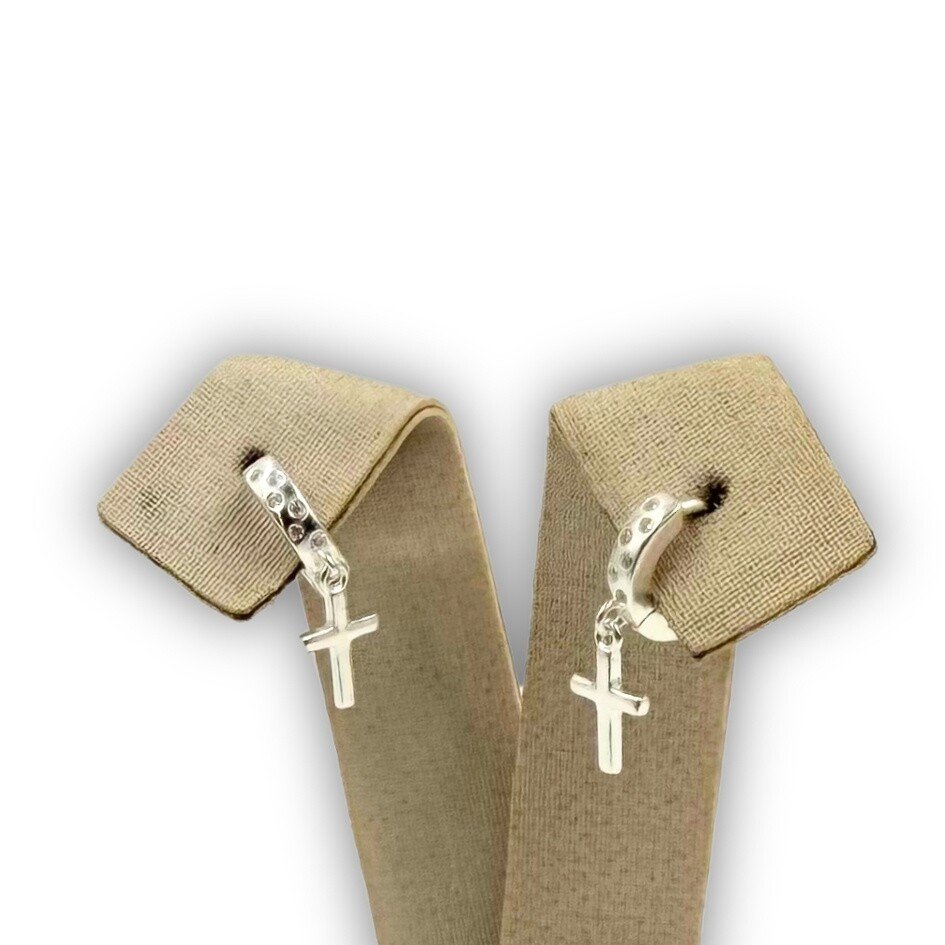 Par de brincos em prata 925. Brincos formato de argolas com pingente de cruz.