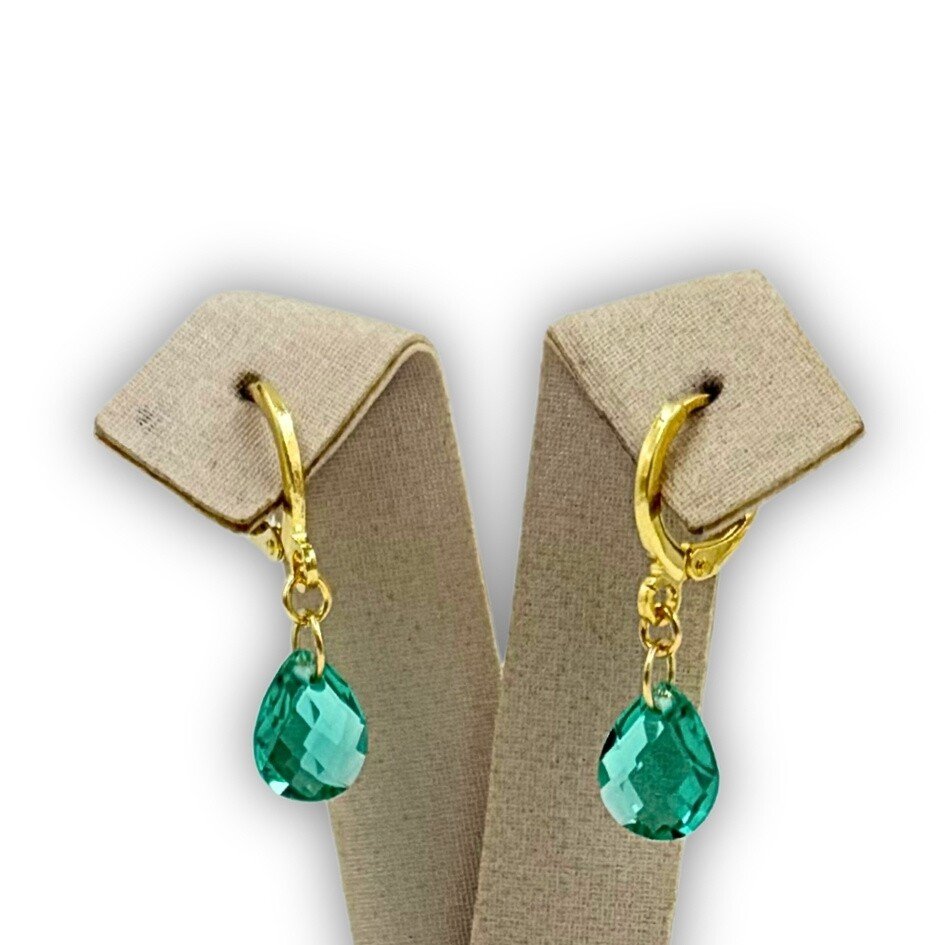 Par de brincos em formato de argolinha com zircônia gota na cor verde.