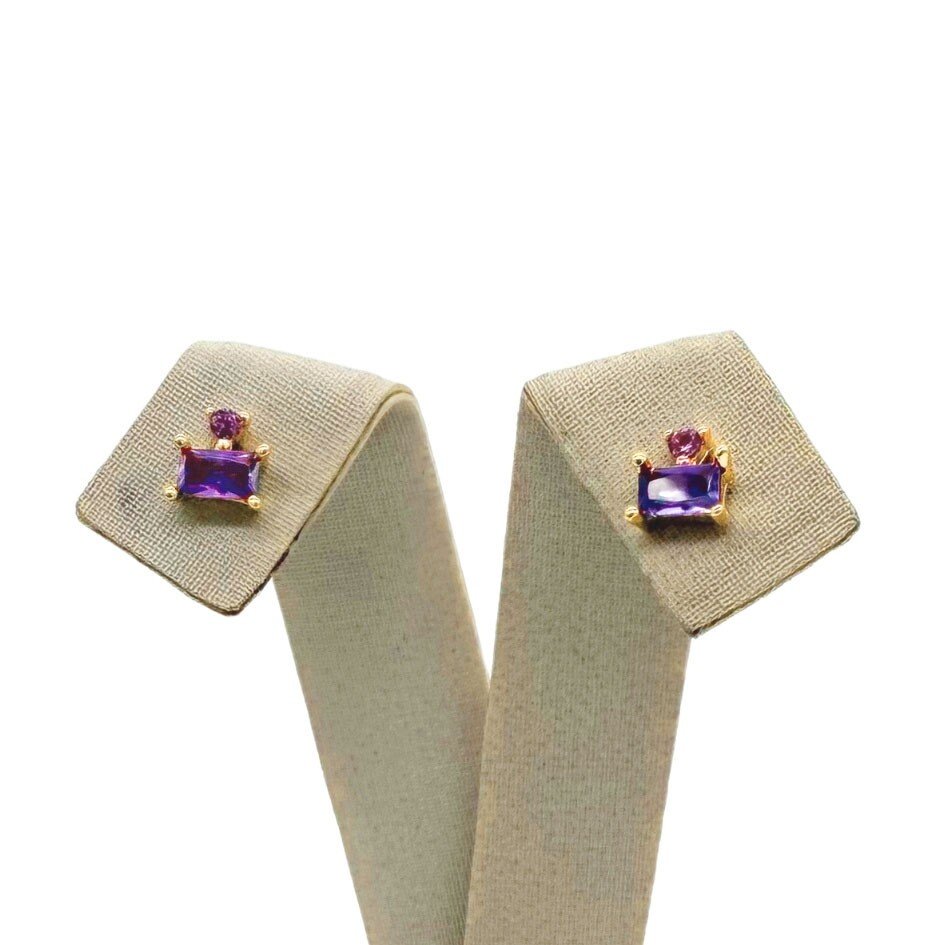 Par de brincos dourados com zircônia retangular na delicada cor lilás, ideal para compor looks modernos com um toque de sofisticação. Fechamento com tarraxas, que garante conforto e segurança no uso.