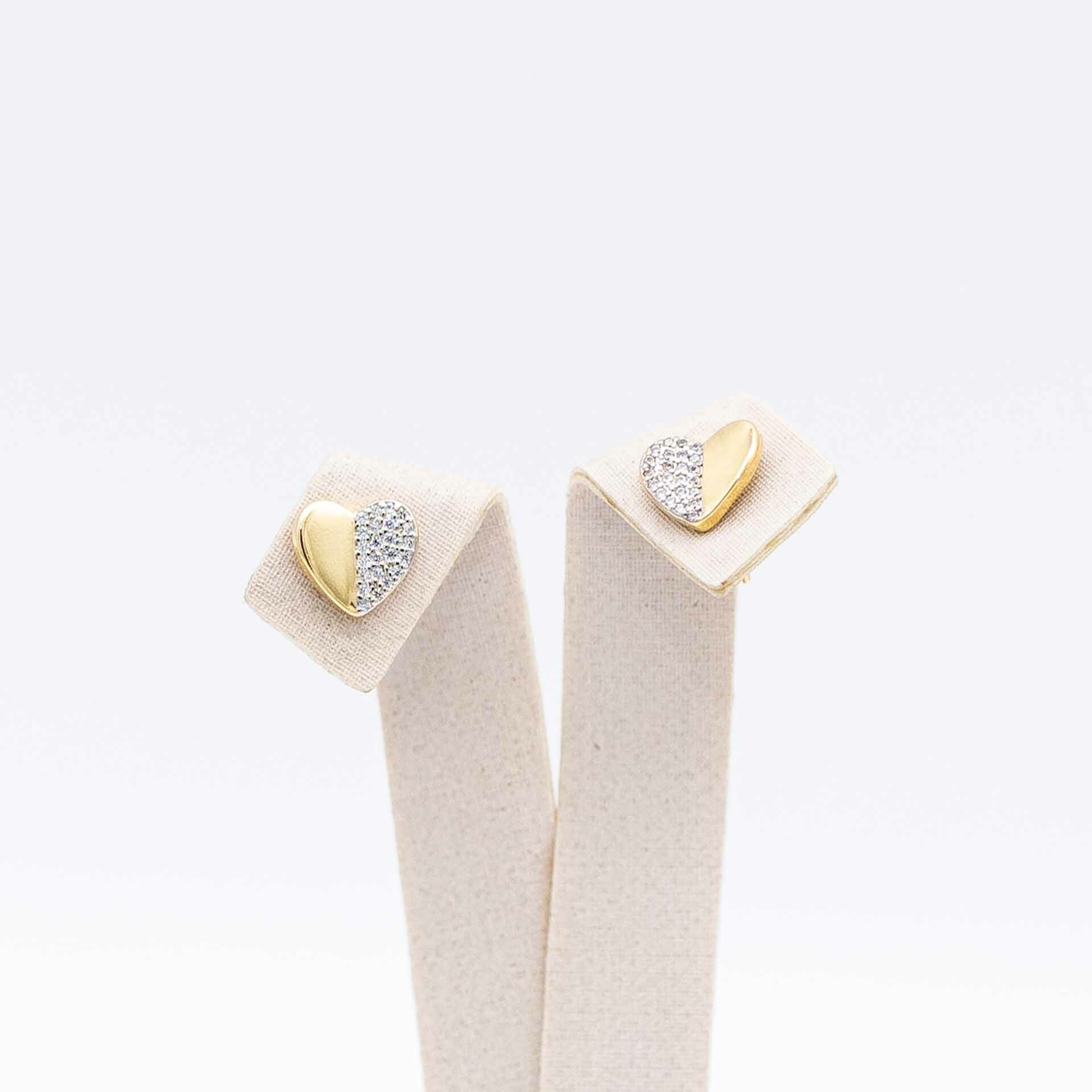 Par de brincos banhados a ouro em formato de coração com zircônias.