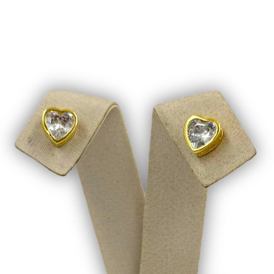 Par de brincos banhados a ouro com zircônia ponto de luz em formato de coração.