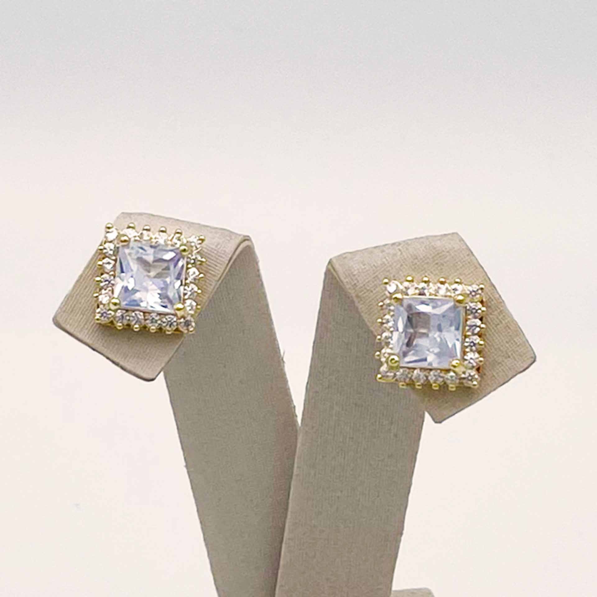 Par de brincos banhados a ouro, em formato quadrado com zircônia cristal.