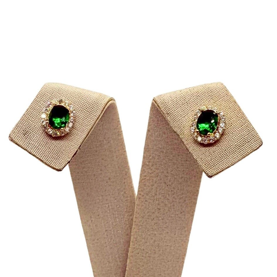 Sofisticação em cada detalhe. Este par de brincos dourados apresenta uma deslumbrante zircônia verde como protagonista, delicadamente emoldurada por microzircônias que adicionam brilho e elegância à peça. Ideal para ocasiões especiais ou para elevar o visual com um toque de cor e requinte.