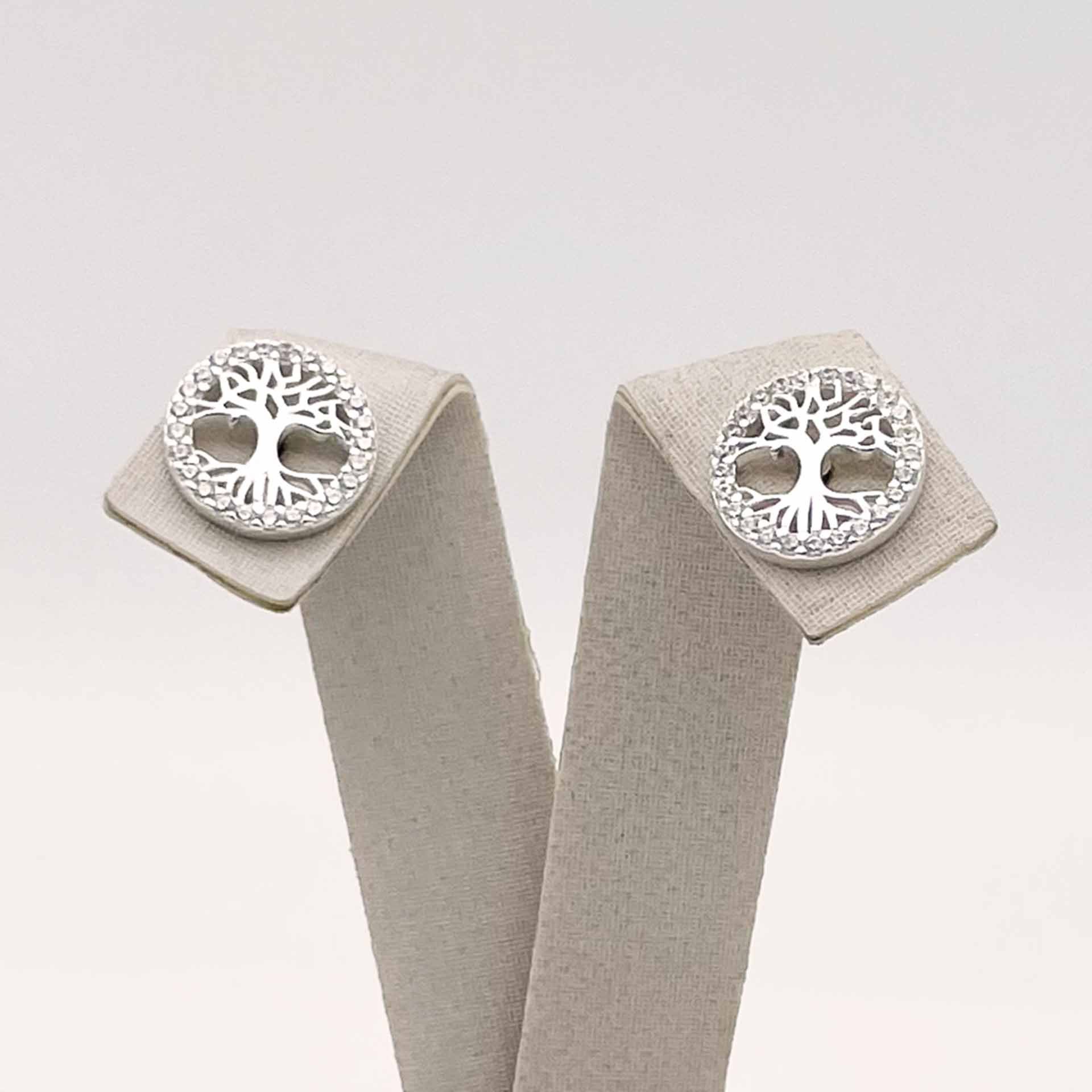 Par de brincos em prata 925, em formato redondo com a imagem da árvore da vida com zircônias.