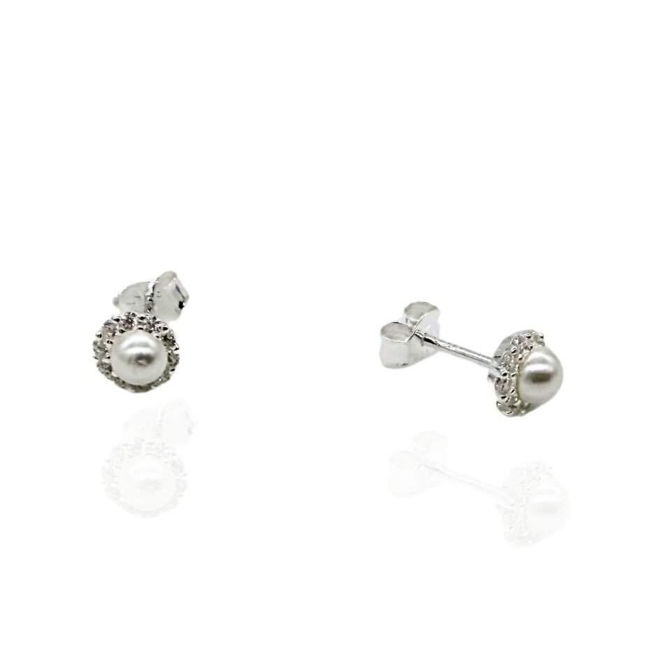 Par de brincos em prata 925 com pérola artificial e delicadas microzircônias. Um toque clássico e sofisticado para qualquer ocasião. Fecho com tarraxas para mais conforto e segurança.