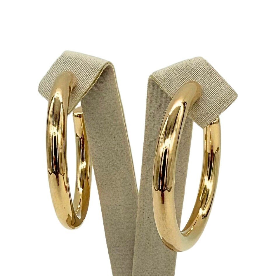 Par de brincos banhados a ouro em formato de argola, clássico e versátil para compor looks atemporais com muito estilo.