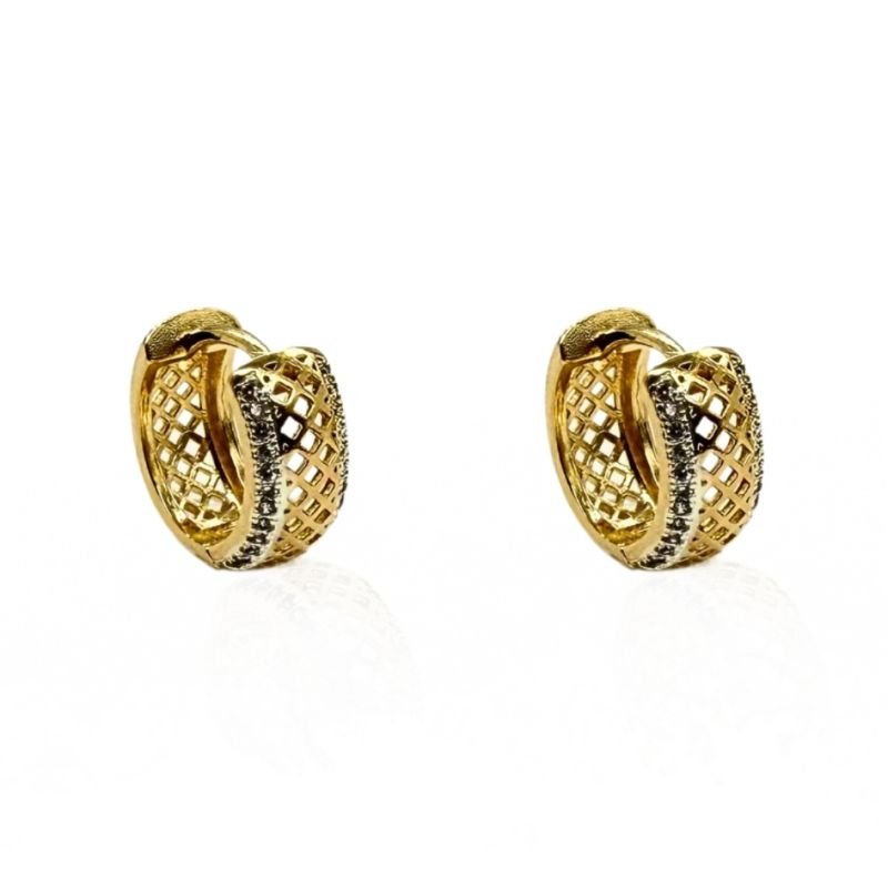 Par de brincos em formato de argola, banhados a ouro e delicadamente cravejados com microzircônias, unindo brilho e elegância em uma peça versátil. Fecho tipo click, prático e seguro.