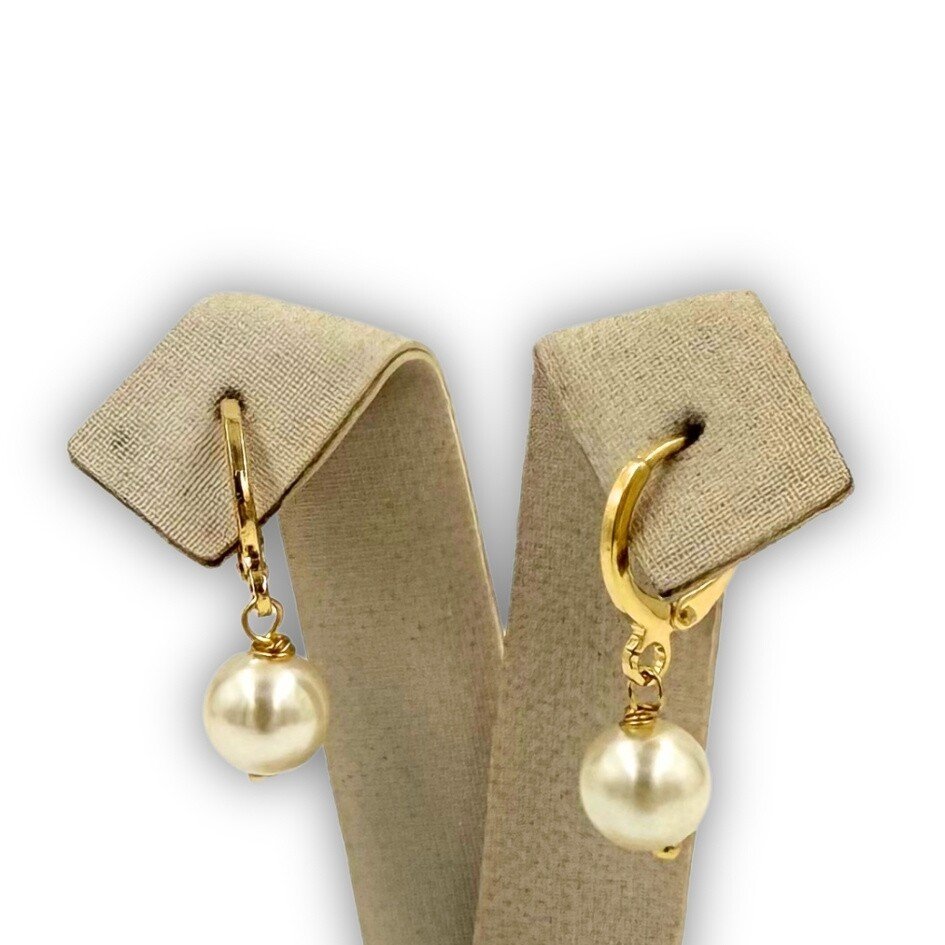 Par de brincos em formato de argola com pingente pérola. Argola com fecho encaixe.