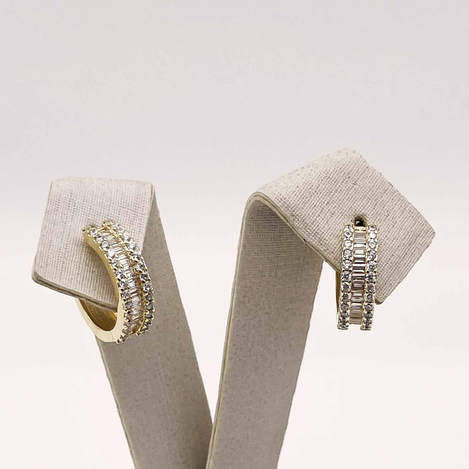 Par de brincos banhados a ouro em formato de argolinha e zircônias. Argola com fecho de encaixe.