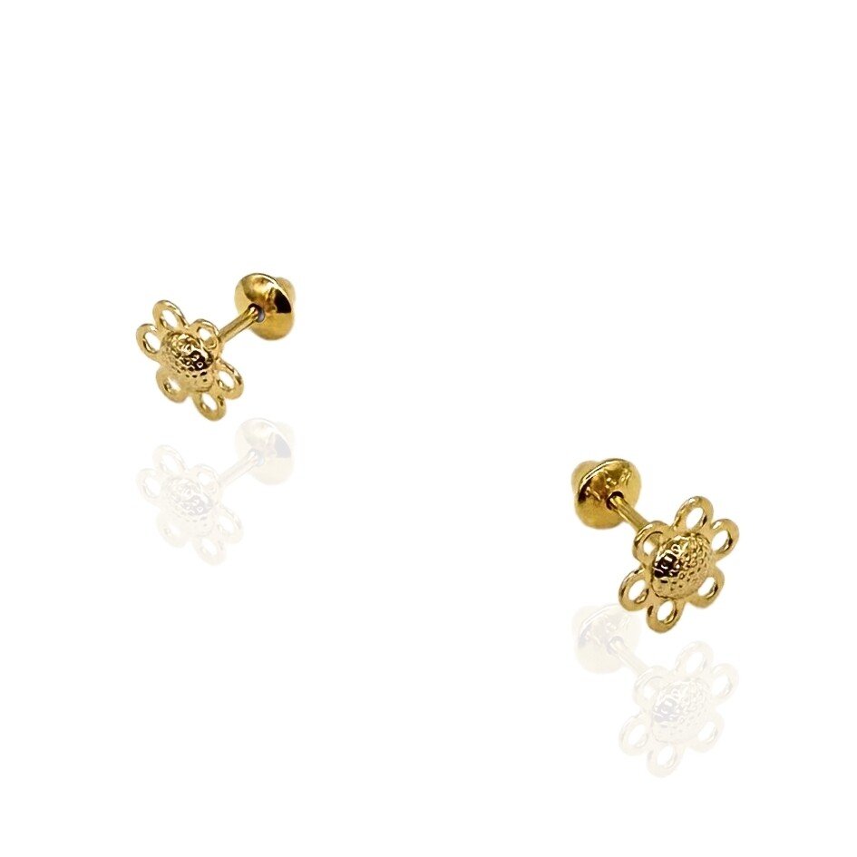 Par de brincos infantis banhados a ouro em formato de flor, delicados e perfeitos para trazer ainda mais charme e fofura ao visual das pequenas.