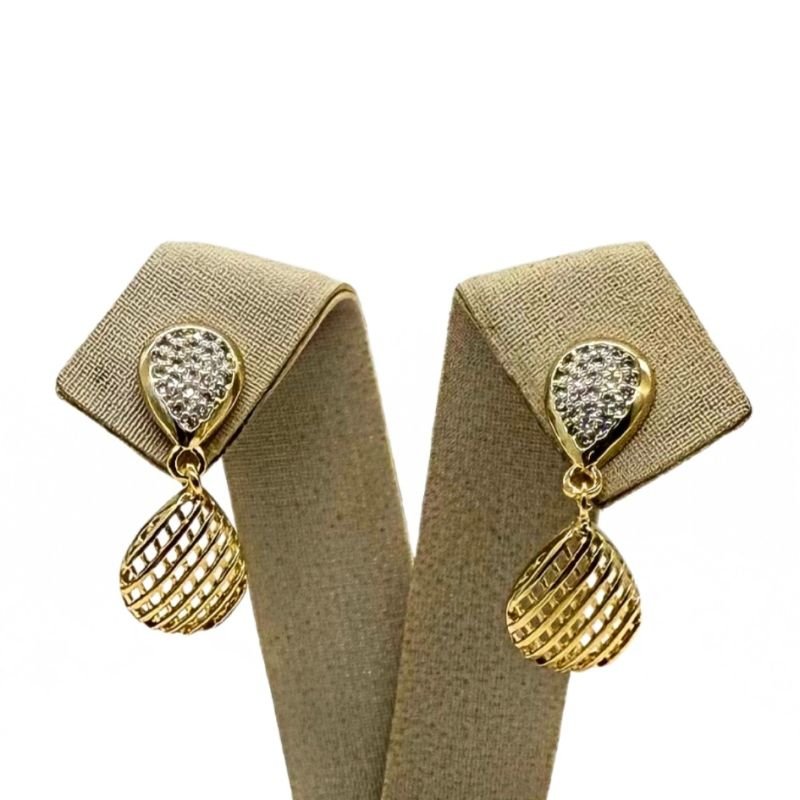 Par de brincos banhados a ouro, em formato de gota, delicadamente adornados com zircônias. Possuem fecho tarraxa para maior segurança e conforto. Uma joia elegante e versátil, ideal para iluminar qualquer ocasião.
