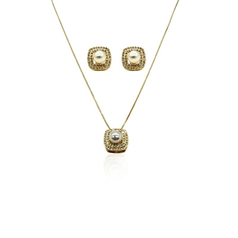 Conjunto banhado a ouro composto por gargantilha com pingente e brincos com pérola e delicadas microzircônias. Um design clássico e sofisticado, perfeito para realçar a elegância com brilho sutil.