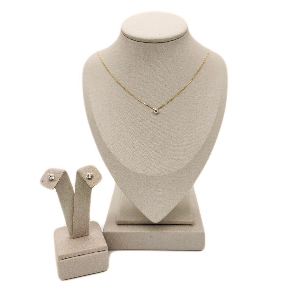 Elegante e atemporal, este conjunto banhado a ouro é composto por uma delicada gargantilha estilo veneziana com pingente de zircônia ponto de luz, acompanhada de brincos combinando.