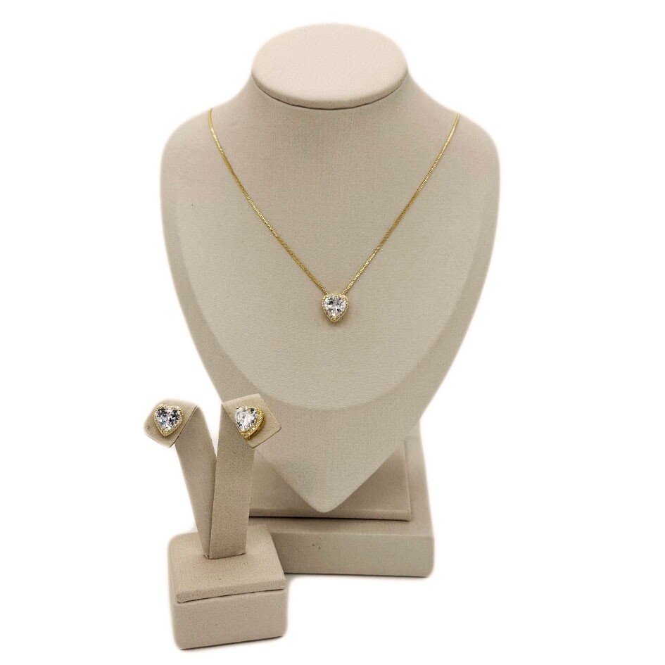 Romântico e elegante, este conjunto dourado é composto por uma gargantilha estilo veneziana de tamanho ajustável, brincos e pingente com zircônias em formato de coração e adornados com microzircônias. Perfeito para adicionar um toque especial de brilho e delicadeza ao seu visual.
