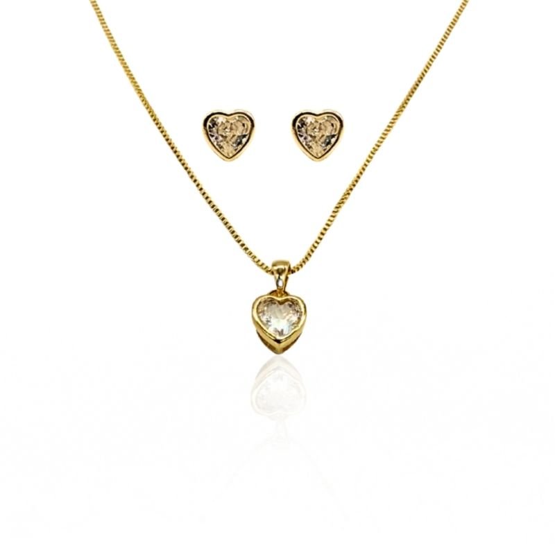 Delicado e encantador, este conjunto dourado traz uma gargantilha estilo veneziana com tamanho ajustável, acompanhada de brincos e pingente de zircônias em formato de coração. Uma escolha perfeita para expressar amor e beleza em cada detalhe.