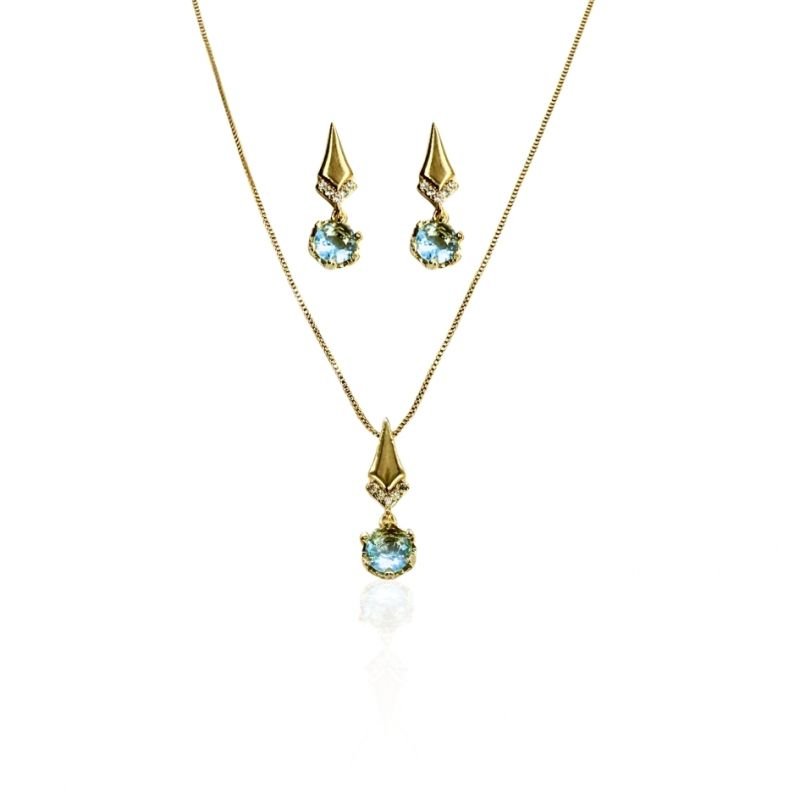 Conjunto elegante banhado a ouro: gargantilha estilo veneziana com tamanho ajustável e pingente em zircônia cristal azul, acompanhada por belíssimos brincos combinando. Sofisticação em cada detalhe!