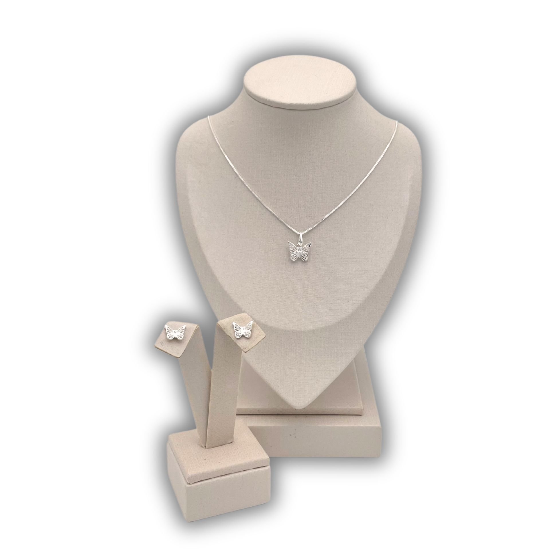 Gargantilha estilo veneziana, com pingente e brincos em formato de borboleta e zircônias.