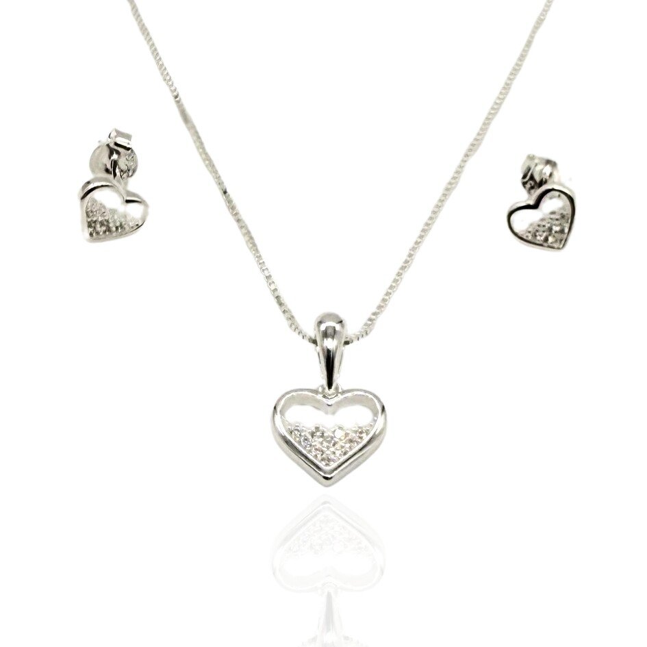Gargantilha com pingentes e brincos em forma de coração com microzircônias.