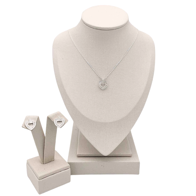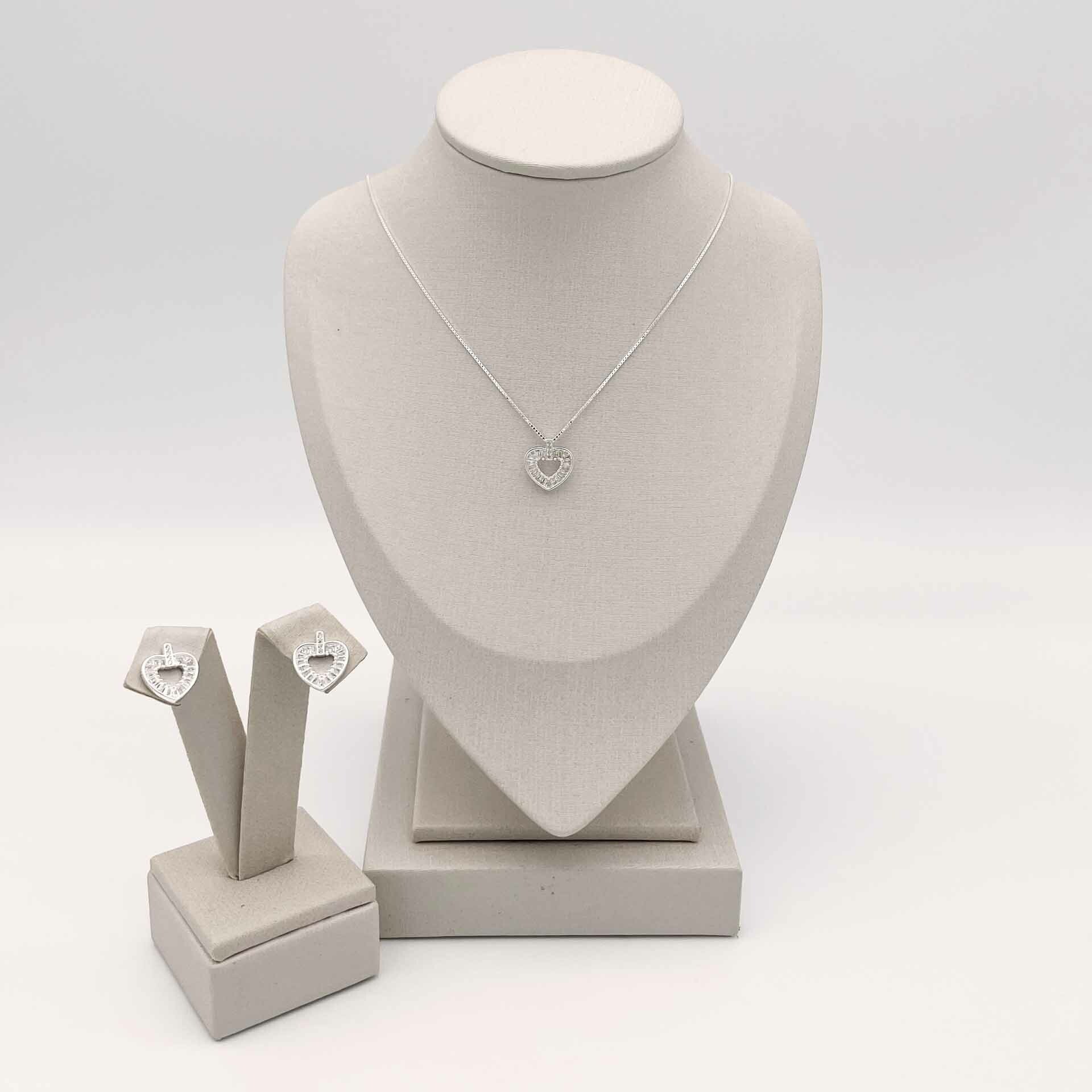 Conjunto em prata 925. Pingente e brincos em formato de coração com zircônias.