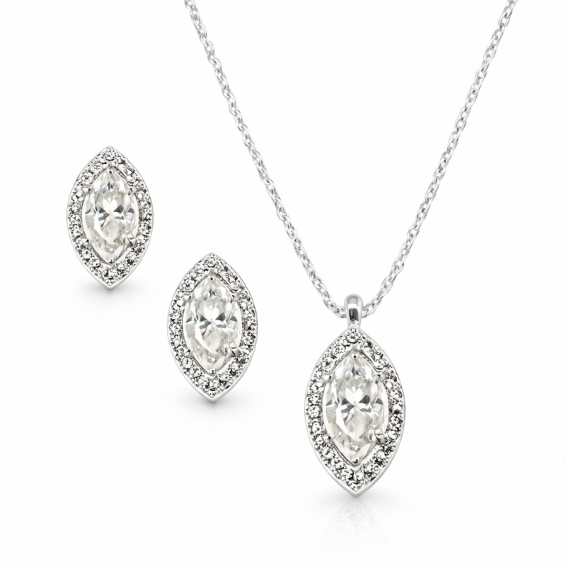 Realce sua beleza com este elegante conjunto em Prata 925 com moissanite lapidação navete, uma pedra conhecida por seu brilho extraordinário e aparência sofisticada.