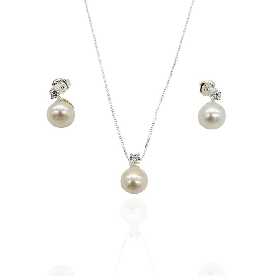 Conjunto de gargantilha, estilo veneziana, com pingente e brincos com pérola e zircônias.