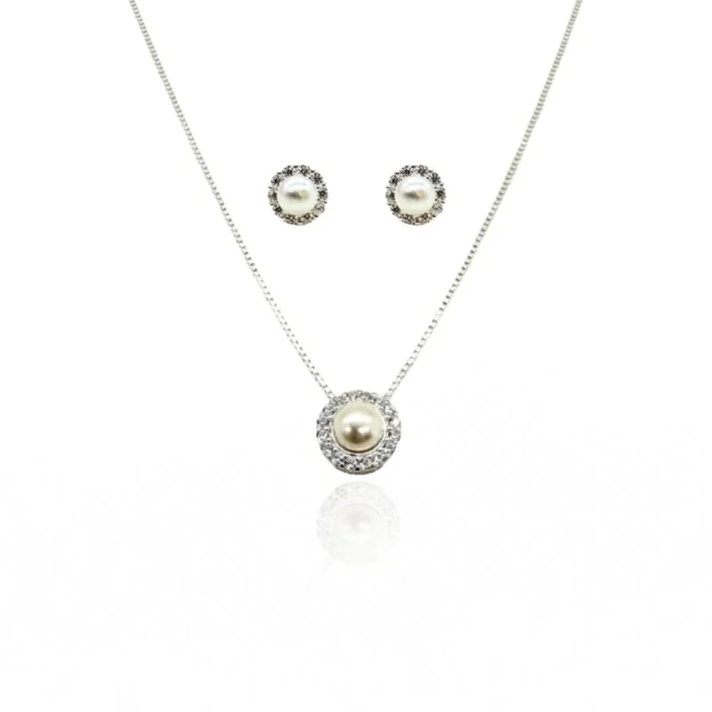 Delicado e sofisticado, este conjunto em prata 925 une o charme clássico das pérolas ao brilho sutil das microzircônias, criando uma joia elegante e atemporal. A gargantilha veneziana traz um pingente em formato redondo com pérola central rodeada por microzircônias que refletem a luz com suavidade. Os brincos no mesmo design completam o conjunto com harmonia e requinte.