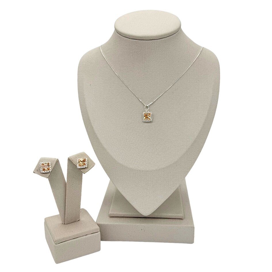 Charme e delicadeza em uma joia única. Este conjunto em prata 925 traz uma sofisticada gargantilha com corrente estilo veneziana e pingente, combinando perfeitamente com os brincos do mesmo modelo. As peças são adornadas com zircônias na tonalidade champanhe, realçadas por microzircônias que conferem um brilho sutil e refinado.