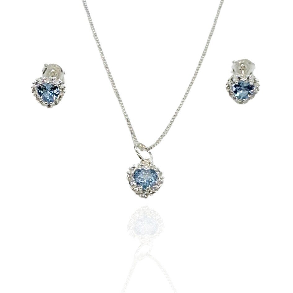 Encanto e delicadeza em cada detalhe. Este conjunto em prata 925 é composto por uma elegante gargantilha com corrente estilo veneziana e pingente em forma de coração, acompanhada por brincos que seguem o mesmo design. As peças são adornadas com zircônias na tonalidade azul água-marinha, cercadas por microzircônias que adicionam brilho e sofisticação à composição.